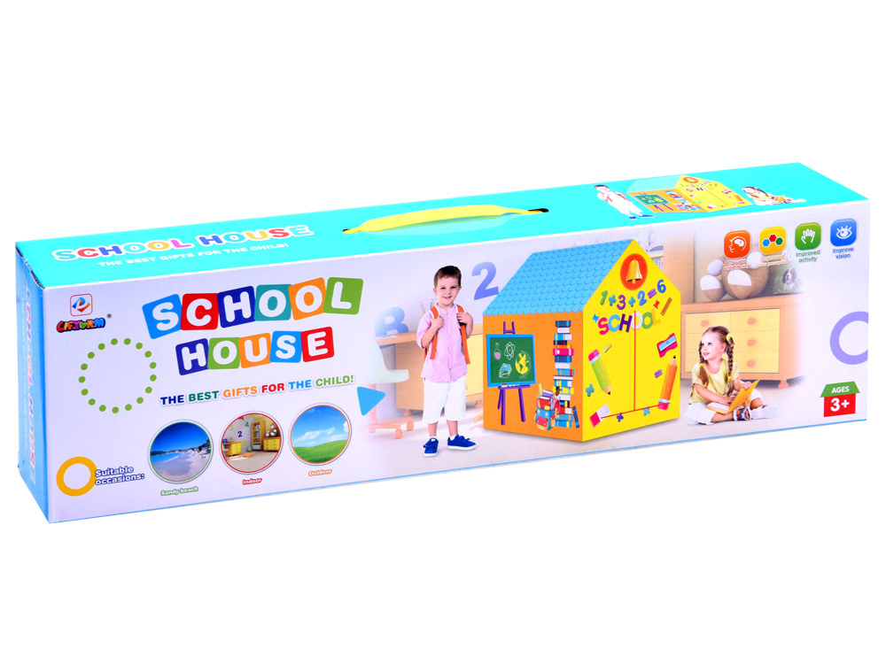 Duży, przestronny namiot kolorowej szkolnej grafice przeznaczony jest dla dzieci lubiących kreatywną zabawę. Namiot pozwoli na zabawę w szkołę, uczniów i nauczycieli. Rewelacyjny domek zapewni mnóstwo wesołej, fantastycznej i pomysłowej zabawy każdemu dziecku. Zestaw jest bardzo dokładnie i starannie wykonany, w żywych, kolorowych barwach.