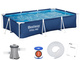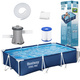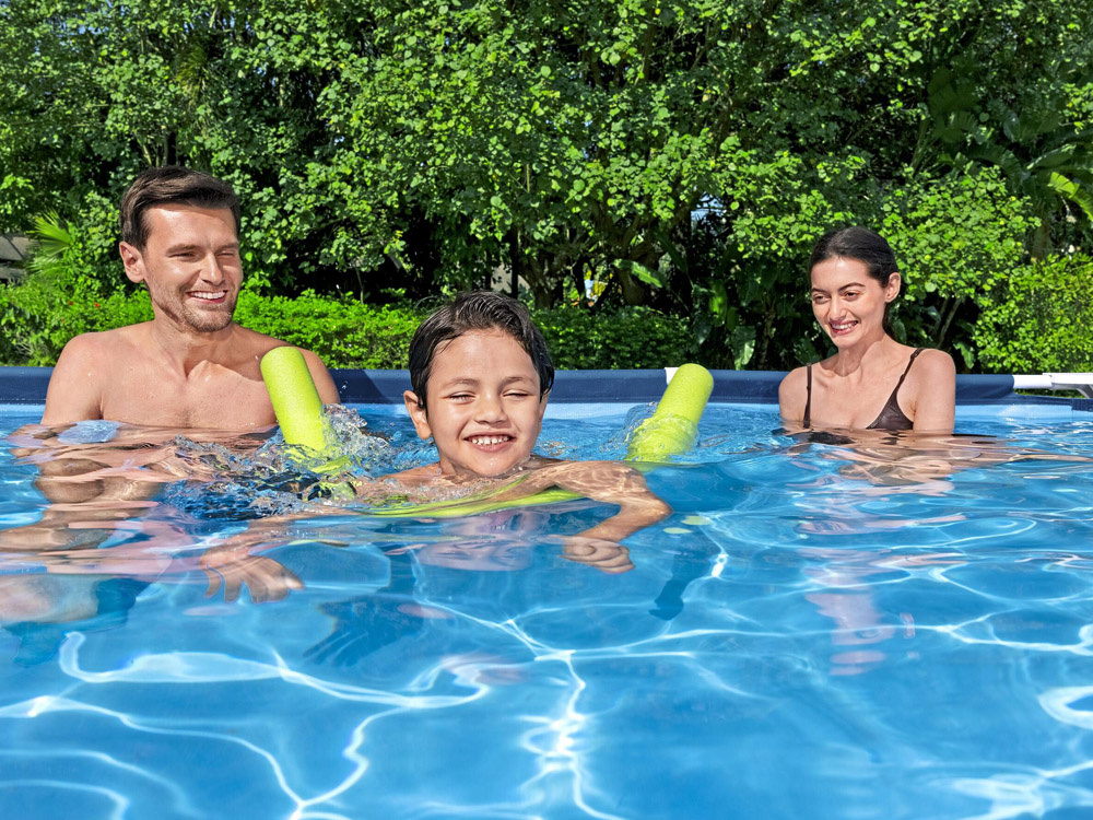 Potrzebujesz czasami ochłody w upalny dzień a nie masz czasu iść na basen miejski lub jechać nad wodę? Dlatego przedstawiamy ten rewelacyjny stelażowy basen przeznaczony do relaksu w upalne dni dla całej rodziny. Rozłożysz go bardzo szybko, napełnisz wodą i relaks gotowy. Duży, prostokątny basen o wymiarach 300 x 201 x 66cm i pojemności 3,300l wody pomieści wszystkie dzieci potrzebujące ochłody. Dla szybkiego spuszczenia wody służą specjalne zawory. O filtrację wody zadba pompa o wydajności 1,249l/h. Produkt wykonano z materiału Tritech- jest to materiał z rdzeniem z siatki poliestrowej połączony z dwiema warstwami grubego PVC. Gwarantuje to dużą wytrzymałość i trwałość.