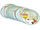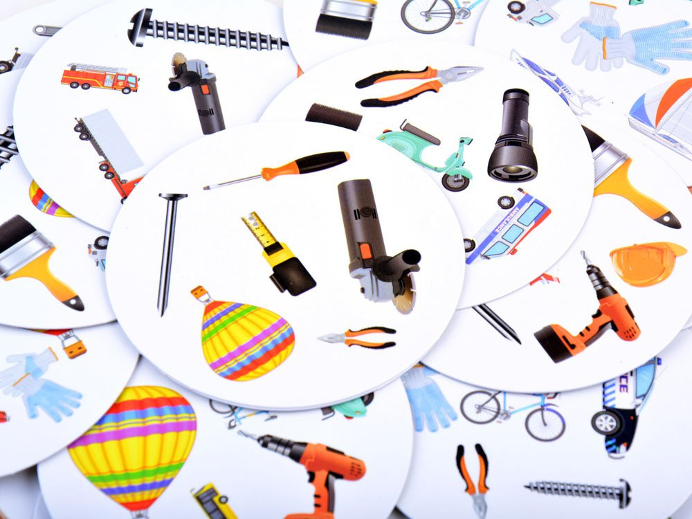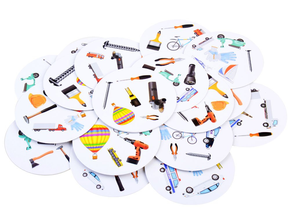 To make it difficult to play, the symbols on the cards are sometimes rotated and have different sizes. The cards themselves are round and full of colorful illustrations, each one unique and connected to the other cards with one and only one symbol.