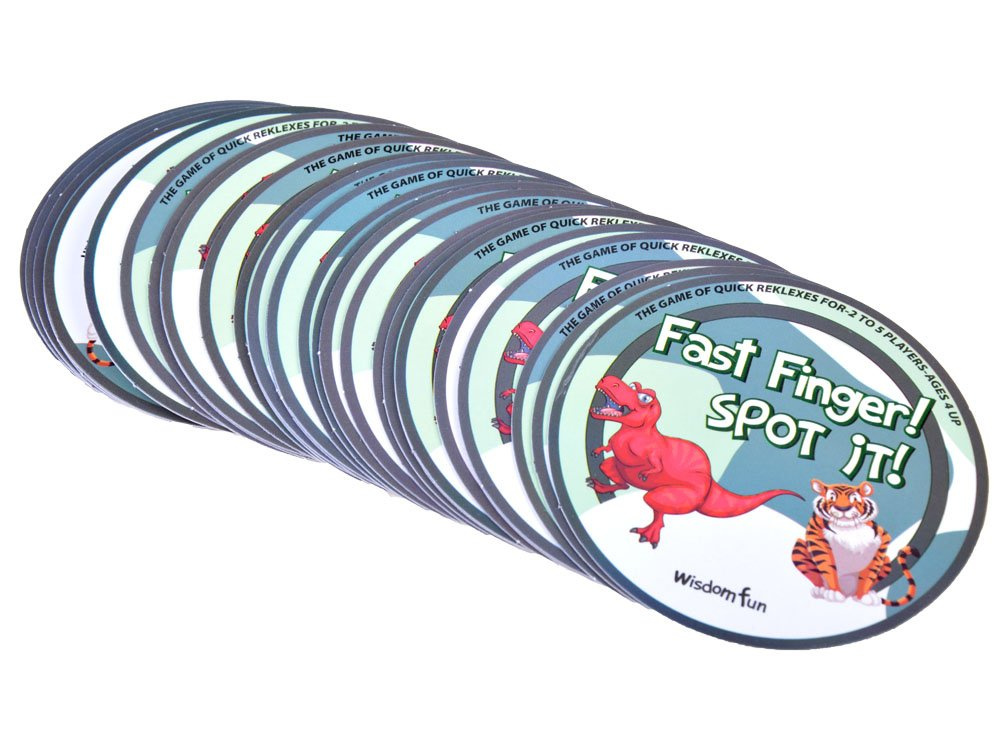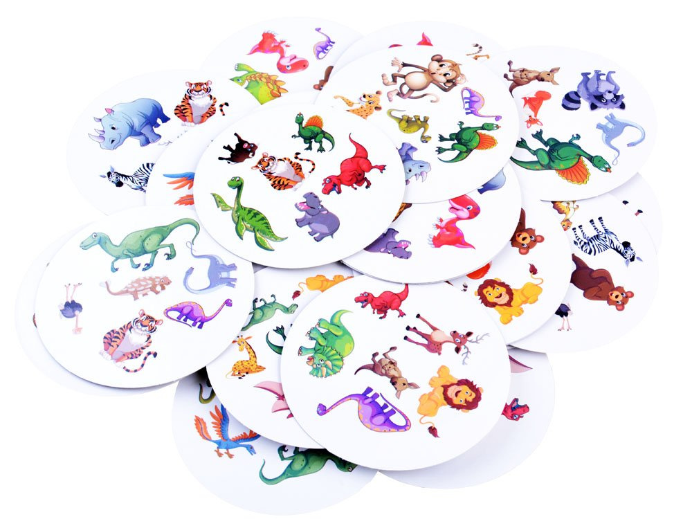 The players turn their cards over. Everyone must find an identical item on any other player's card. The first player to name a matching animal takes the top card from the draw pile and places it on top of any player's card.