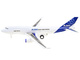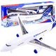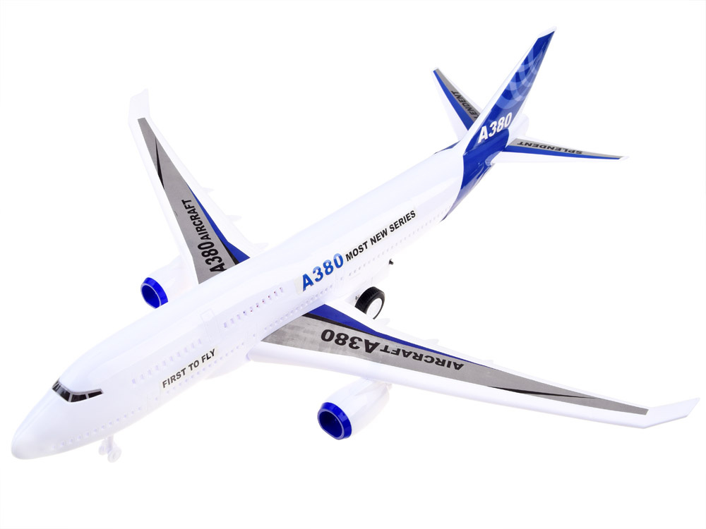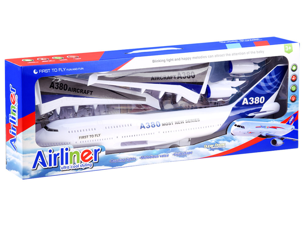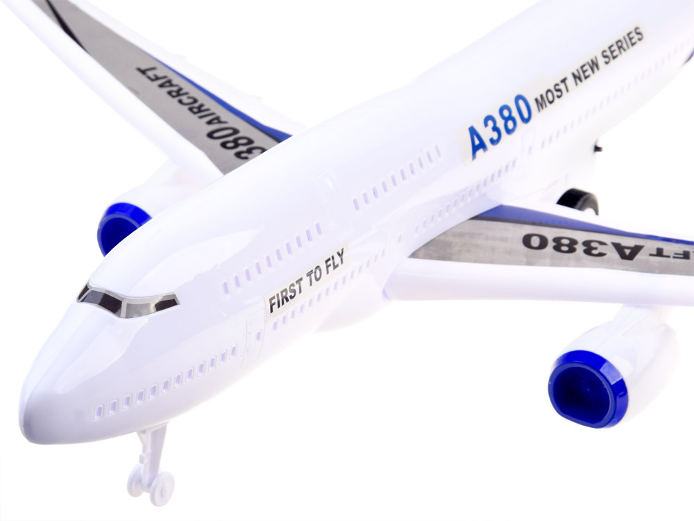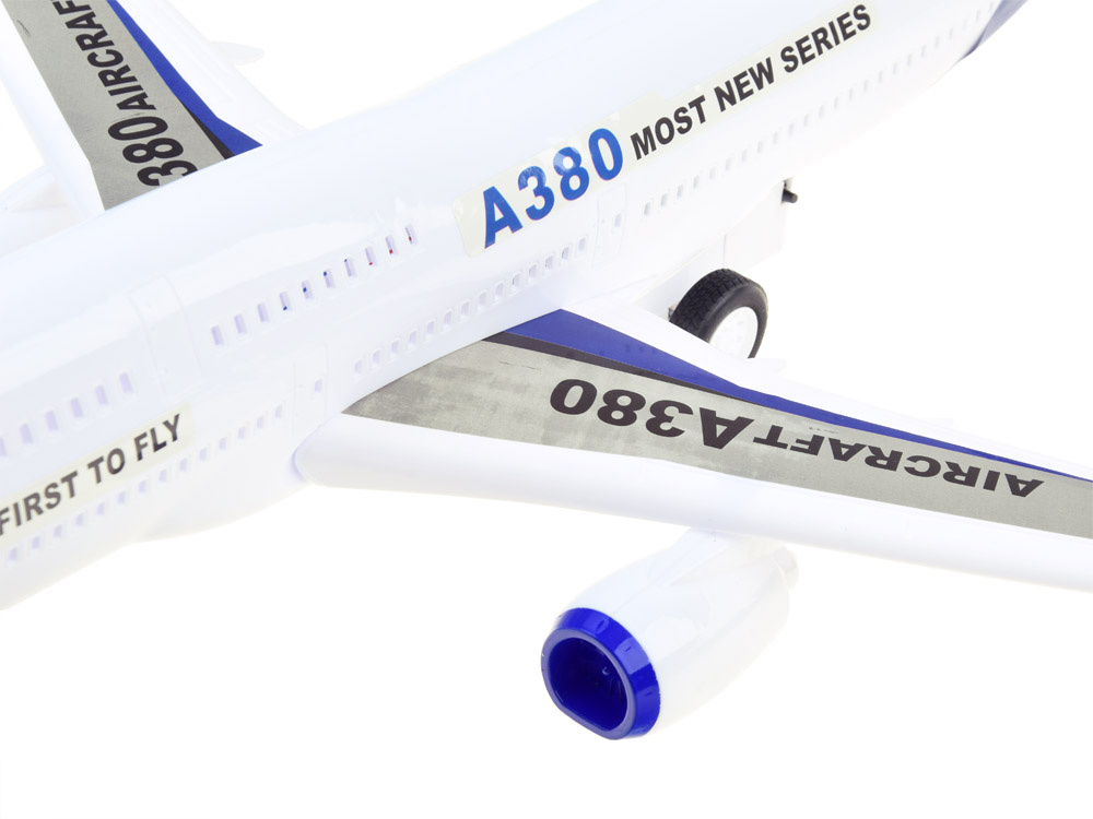 The plane is made of high-quality plastic, with attention to detail. Colorful stickers decorate the fuselage, wings and tail. The vehicle has a drive, so it is possible to designate an airport and taxi on the runway. There is a switch in the chassis that activates the sound and light functions of the toy. After starting, we will hear the sound of take-off, landing and engine operation. The sounds are accompanied by flashing lights inside the fuselage.