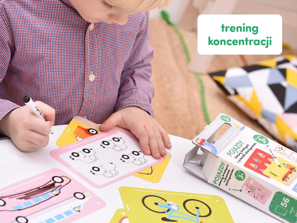 Colorful illustrations of various vehicles inspire children to play creatively. Cards allow you to draw and erase multiple times. The set also includes a guide for parents with ideas for games and information about children's graphomotor development. It is a great idea for an educational and creative gift for a preschooler. Perfect for traveling with a child.