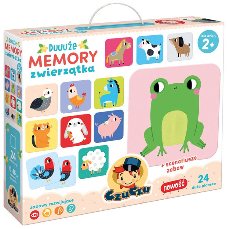 Czuczu Duuuże Memory Animals is an educational game that allows toddlers to exercise memory, concentration and perceptiveness. The educational set consists of really large, beautifully illustrated elements. The difficulty level can be adjusted to the child's abilities, starting with playing with two or three pairs, adding more animals over time. You can play with the boards in many different ways - the set includes a guide with 28 scenarios for educational fun.