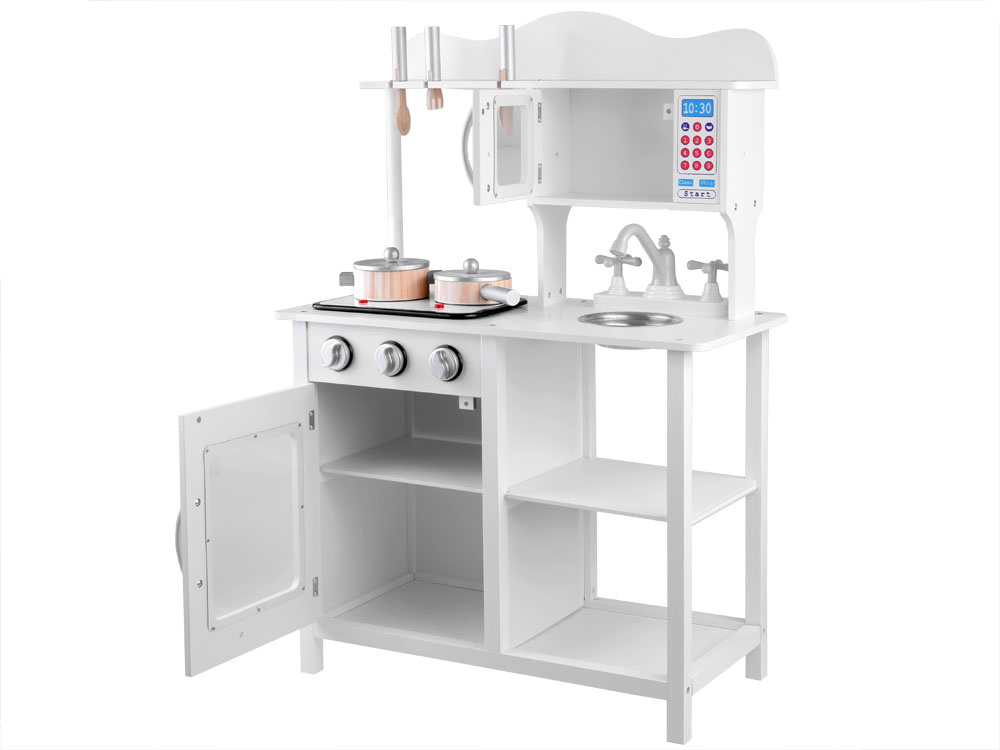 This elegant white play kitchen with accessories is the perfect gift for any child who loves to cook and imitate everyday activities. With realistic features and safe materials, it guarantees hours of imaginative and joyful play.