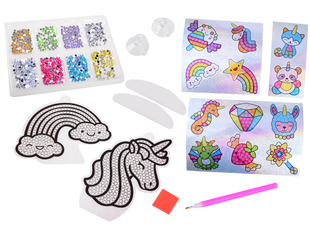 Diamond embroidery creative set MAGIC is the most fashionable creative fun for children of this season. The set allows you to create beautiful patterns of fabulously colored diamonds. The fun is to choose the right colors of the diamonds and transfer them to a template with glue using a special pen. After arranging the elements, we get a beautiful colorful decoration. With the help of the included: plastic stands and silicone suction cups with hooks, the works can be put on e.g. a desk, on a shelf, hung on a glass, mirror or decorated with your favorite notebook, briefcase or diary.