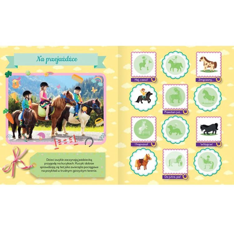 and photographs of ponies and a rich set of round stickers, easy to apply even for children. By playing with stickers, children will improve their
