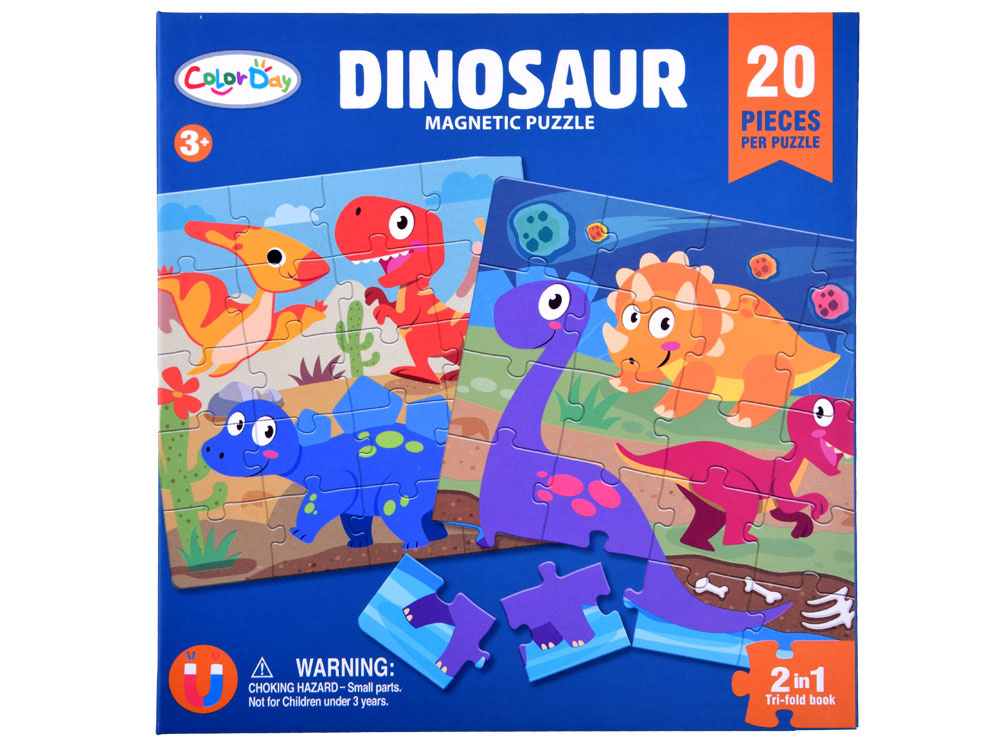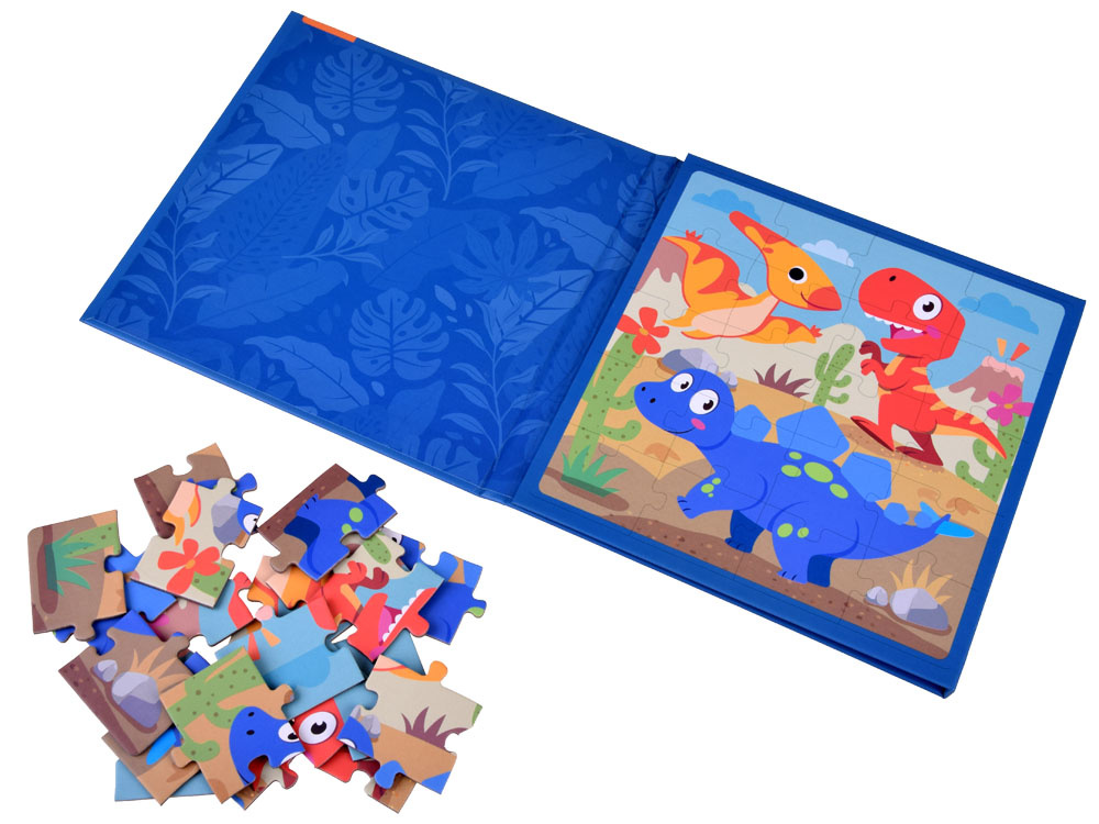 Każda plansza składa się z 20 elementów. Dziecko układając puzzle na magnetycznej płaszczyźnie będzie mogło korzystać z przykładowego obrazka przedstawiającego dinozaury. Dzięki temu iż zestaw jest magnetyczny łatwiej się układa puzzle, nie spadają, nie da się zepsuć wszystkiego nieprzewidzianym ruchem, który u maluchów jest czymś naturalnym. Układanka ćwiczy spostrzegawczość oraz sprawność manualną dziecka. Zestaw świetnie sprawdzi się nawet w podróży, dzięki temu iz puzzle są na swoim miejscu.