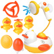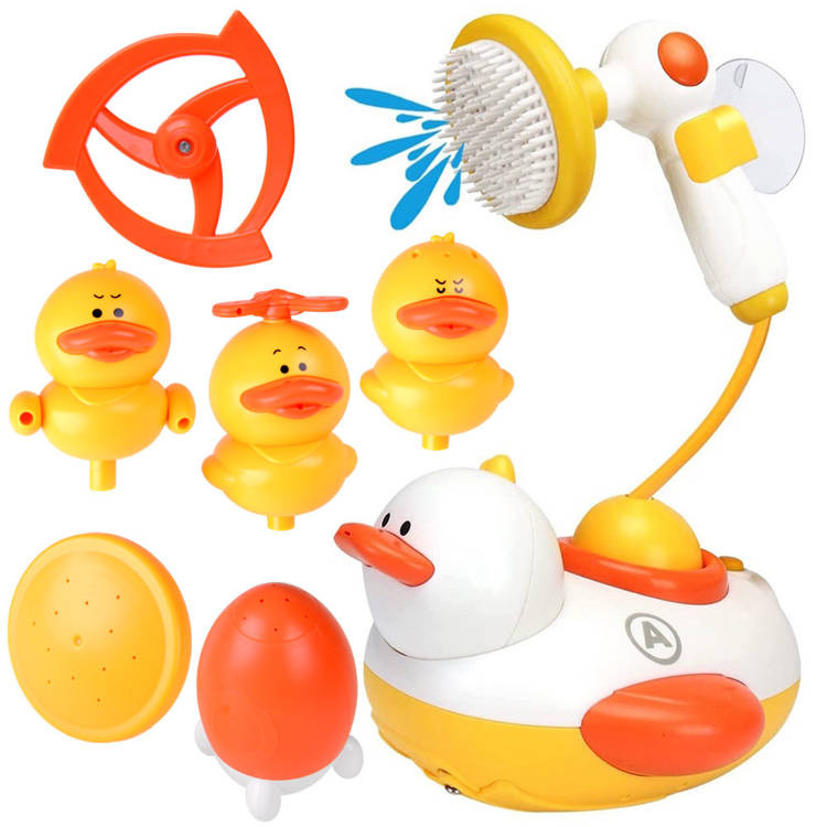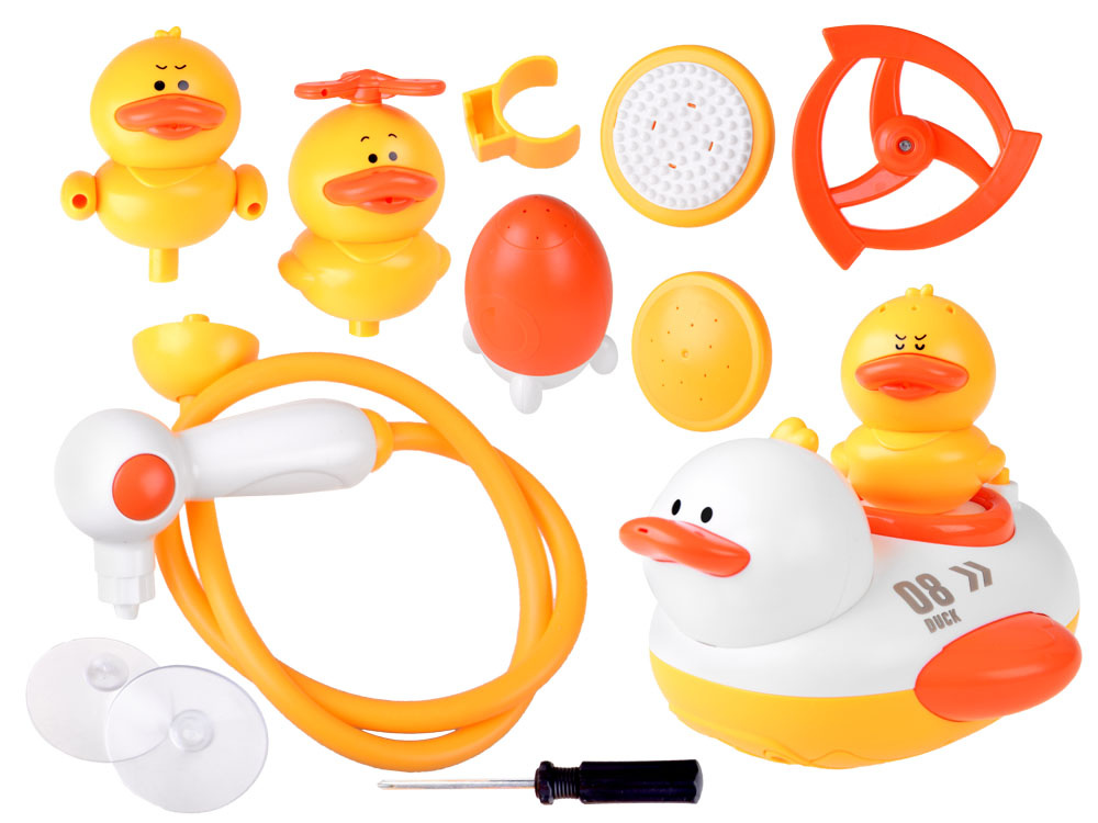Duża kaczka z wymiennymi akcesoriami umożliwia i zachęca dziecko do kreatywnej zabawy, tworząc ciekawe atrakcje podczas kąpieli. Więc wystarczy tylko włożyć baterie, położyć kaczkę na tafli wody, nacisnąć przycisk uruchamiający system pompujący wodę i umieścić wybraną końcówkę. Pływająca kaczka działa jak pompa wodna, a podłączone do niej wymienne różne końcówki mogą spryskiwać, wirować, rozpryskując wodę na różne sposoby.
