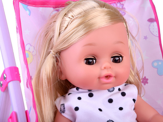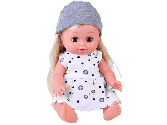 The set includes a beautiful doll with brown eyes and long, blonde hair. She is wearing a lovely white dress with polka dots. The outfit is completed with a gray, thin hat, perfect for walks. The doll's eyes close so it can also sleep. The torso of the toy is made of plastic, and the head, arms and legs are made of rubber.
