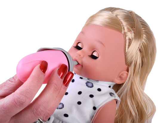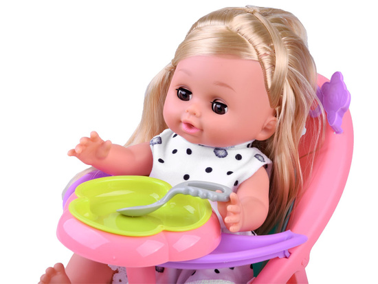 The doll can be watered with the included bottle. It also has a peeing function. The set also includes a diaper and a potty on which you can sit the doll after eating.