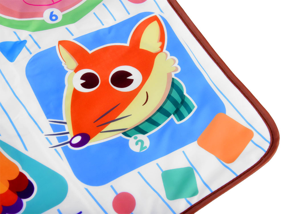 Interaktywna muzyczna mata pamięciowo - zręcznościowa gra dla najmłodszych. Mata wykonana z mięciutkiego materiału, w radosnej grafice kolorowych zwierzaków, zachęci każde dziecko do pojęcia wyzwania w naciskaniu podświetlanych elementów na panelu.
