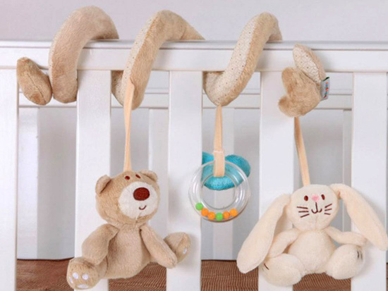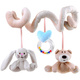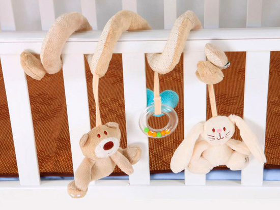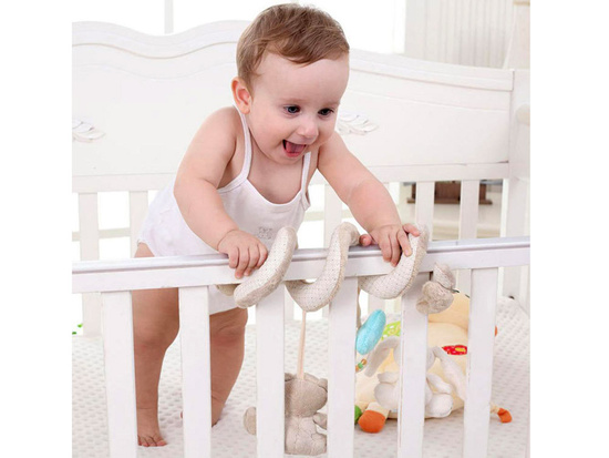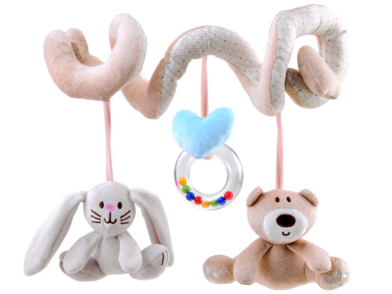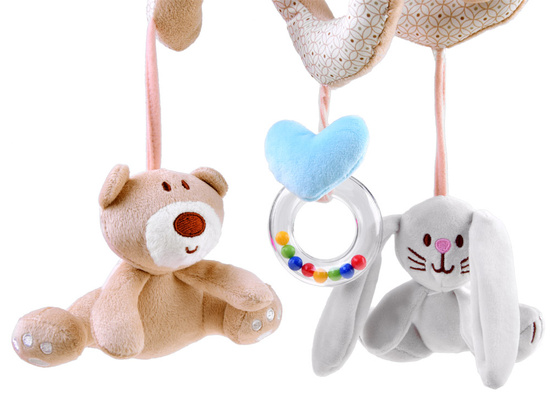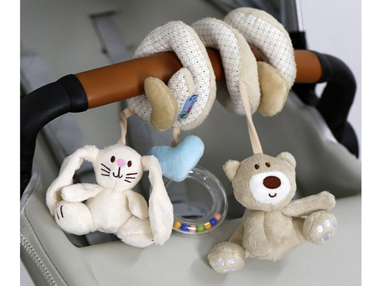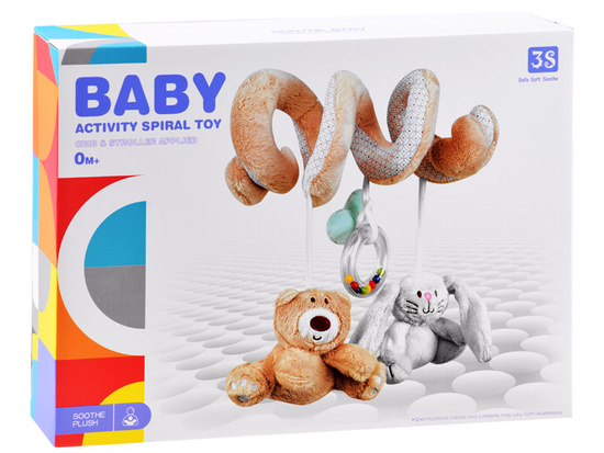 Plush Spiral for a stroller, car seat with mascots is a multifunctional, educational toy designed for the youngest children. The product combines several functions and ensures the proper development of the baby from the first days of his life. It fits perfectly into the modern decor of children's rooms. The pendant can be easily attached to the stroller, above the cot, carrier, gondola or in the car seat so that it will accompany the baby around the clock, both at home and during travel. The spiral for the stroller has a shape that allows the child to have great fun, and the well-thought-out design prevents the pendant from detaching and losing it. Three hanging toys have been attached to the spiral, depicting nice images of a teddy bear, a rabbit and a circle with colorful beads. The product allows the baby to explore the world with the senses of sight and touch, providing him with unique sensory experiences.