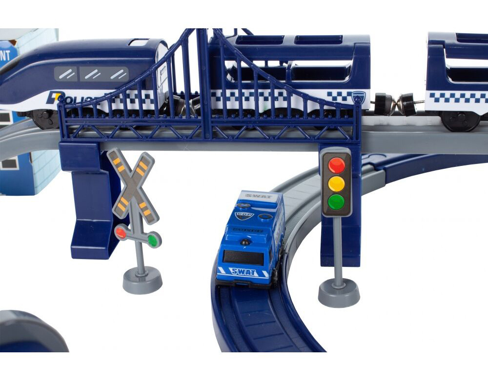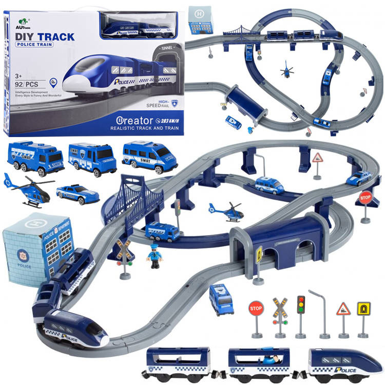 A well-equipped set consisting of 92 elements will allow you to build a route for a train with bridges, viaducts and tunnels. Around the route you can place road signs, a police station with a helipad.