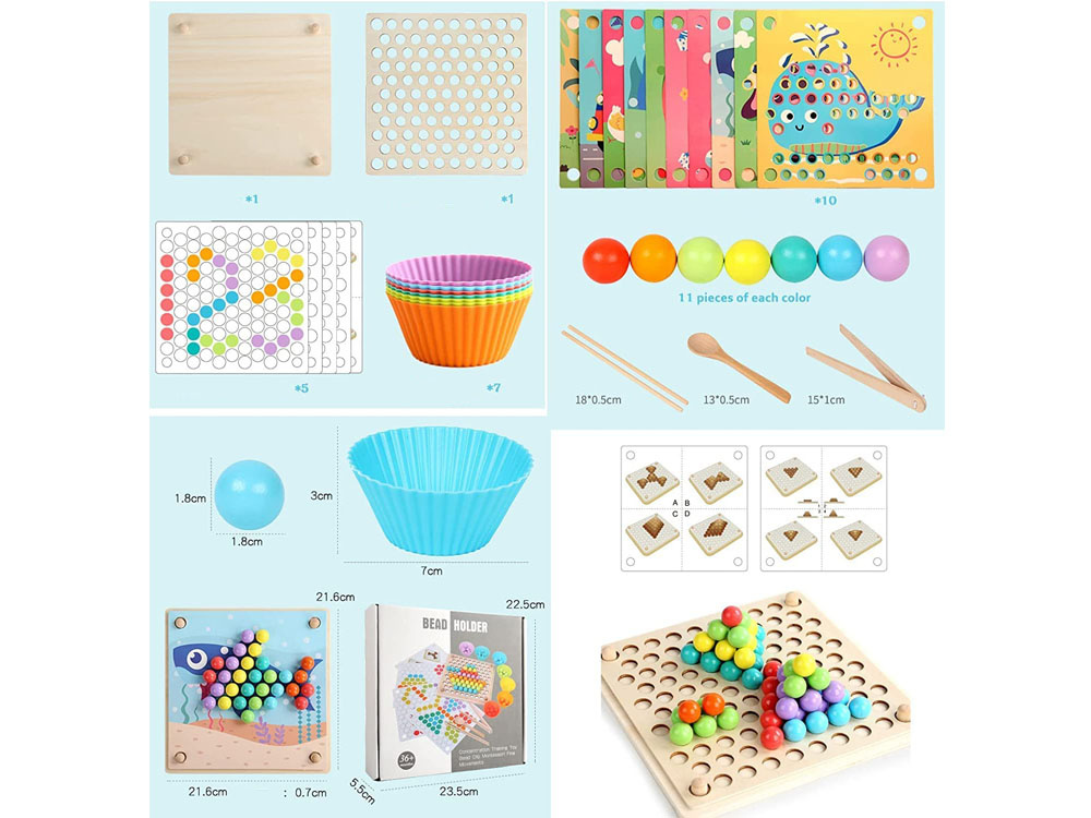 • poprawia zdolności poznawcze - dzięki układaniu koralików w różne wzory, dziecko rozwija zdolności poznawcze, takie jak rozpoznawanie kolorów, kształtów, wzorów i liczenia