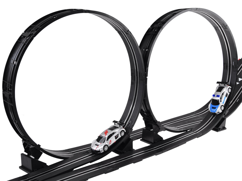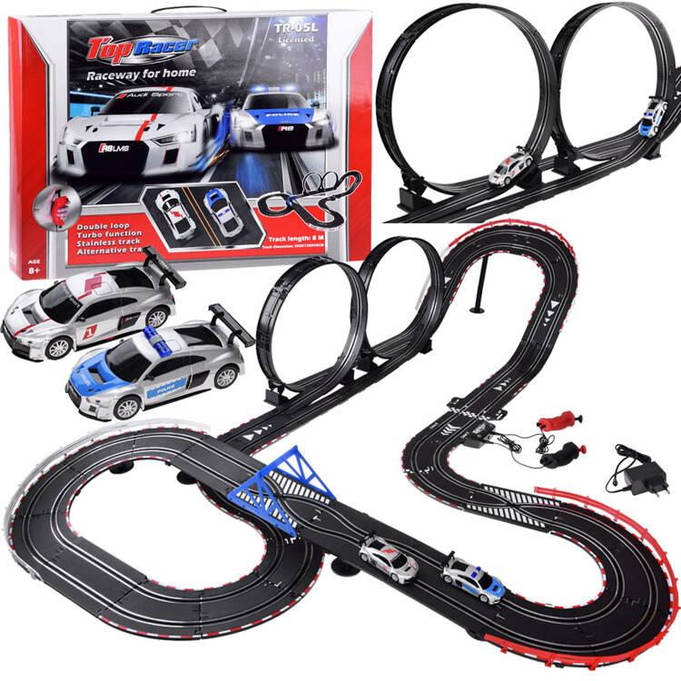 An extra long car racing track is the dream of every little fan of rallies and car racing. A track with a length of up to 8 m with two cars, extreme loops and turns will provide a lot of excitement while having fun. Two super-fast cars licensed by Audi were made with attention to detail. The whole thing looks very impressive.