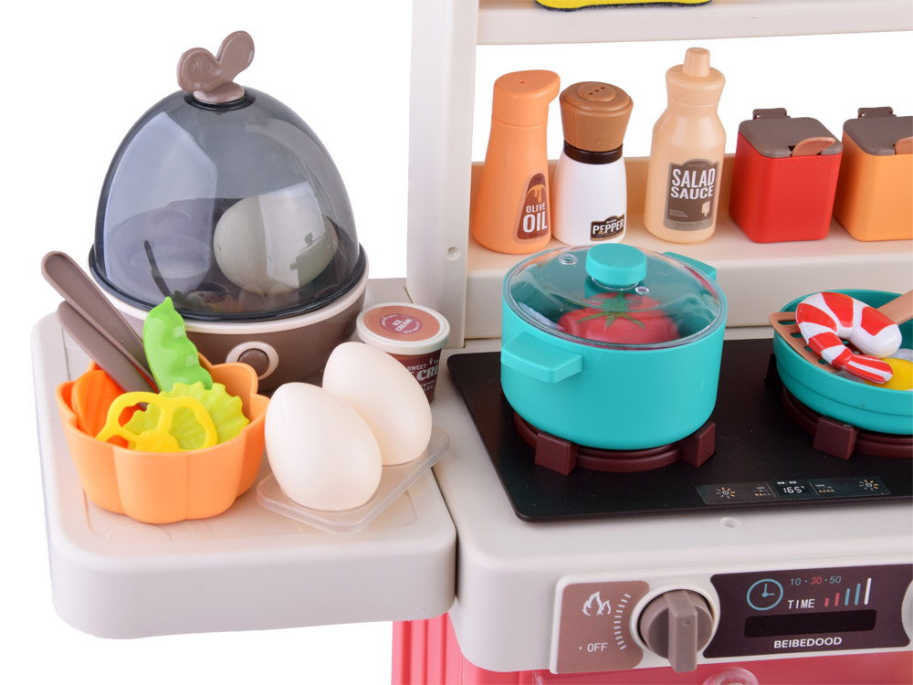 63 elementowy zestaw kuchenny to idealna wolnostojąca kuchnia z wyposażeniem dla małej kucharki, pani domu. Kuchnia w całości wykonana jest z plastiku w atrakcyjnym kremowo-różowym kolorze.