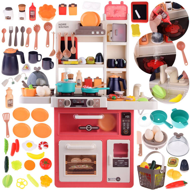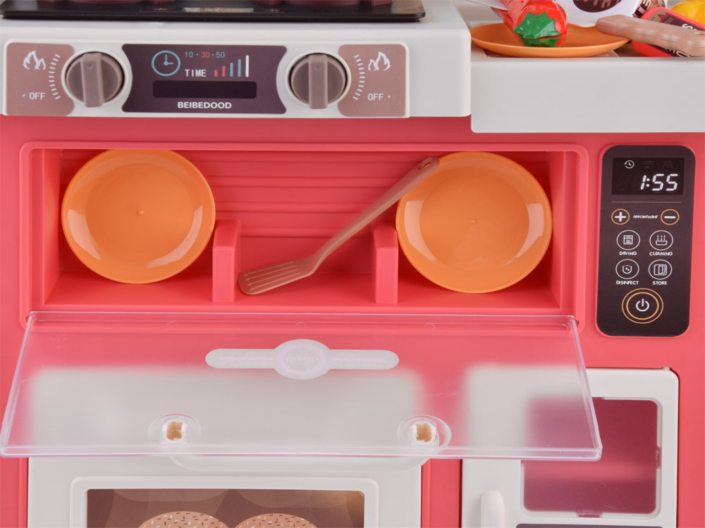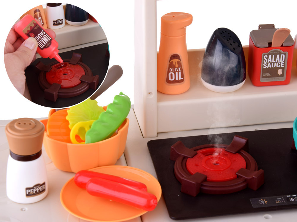 - Kuchenka gazowa z efektem dźwiękowym, parowym i świetlnym. Kuchnia jest wyposażona we wbudowane lampki LED, które odzwierciedlają realistyczne efekty świetlne podczas gotowania. Po przekręceniu palników na kuchence słychać odgłosy gotowania i towarzyszy im mruganie czerwonego światełka. Dodatkowym efektem specjalnym jest para przy gotowaniu (wystarczy wlać odrobinę wody w otwór przy palniku). Palniki na kuchence wydzielają nieszkodliwą parę, co dodaje efektu autentyczności podczas zabawy w gotowanie. Po włączeniu pierwszego pokrętła włącza się pierwszy palnik, świecą światła oraz z palnika wydobywa się para imitująca parującą wodę. Wszystkiego temu towarzyszy dźwięk gotującej się wody (para nie jest gorąca, całkowicie bezpieczna).
