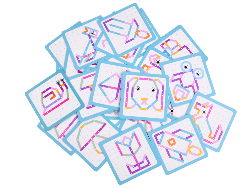A 2-in-1 set with a double-sided board for writing and erasing and arranging colorful pictures using wooden sticks is a great toy for children. A wonderful creative toy that will provide many hours of creative fun. The wooden board is double-sided. On one side there is a board for writing and drawing patterns with a special erasable coating. The set includes a special marker with a sponge. On the other side there is a board with wooden pegs on which sticks with holes of different colors and lengths are placed, thus reproducing the picture on the card. The puzzle offers many possibilities, in addition to ready-made patterns, you can arrange images or shapes of your own imagination.