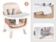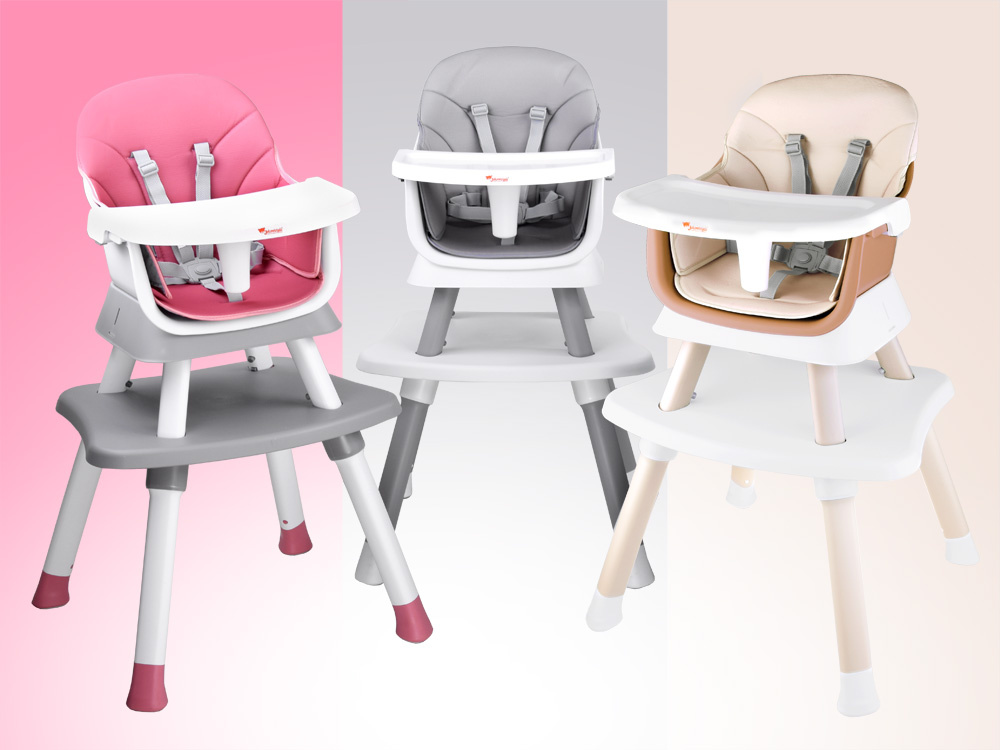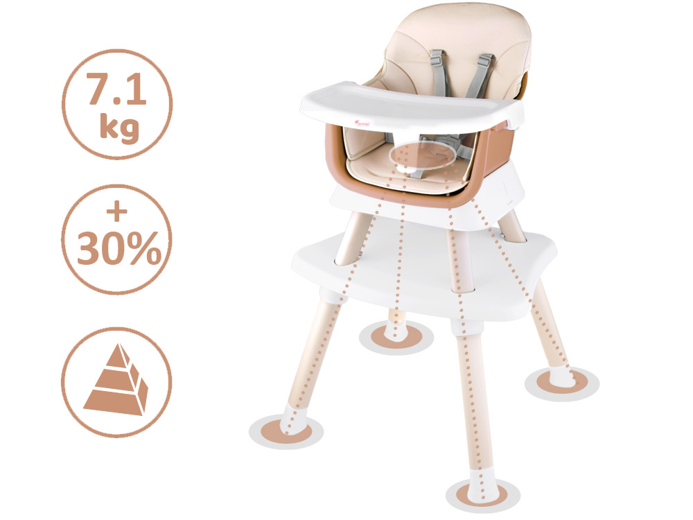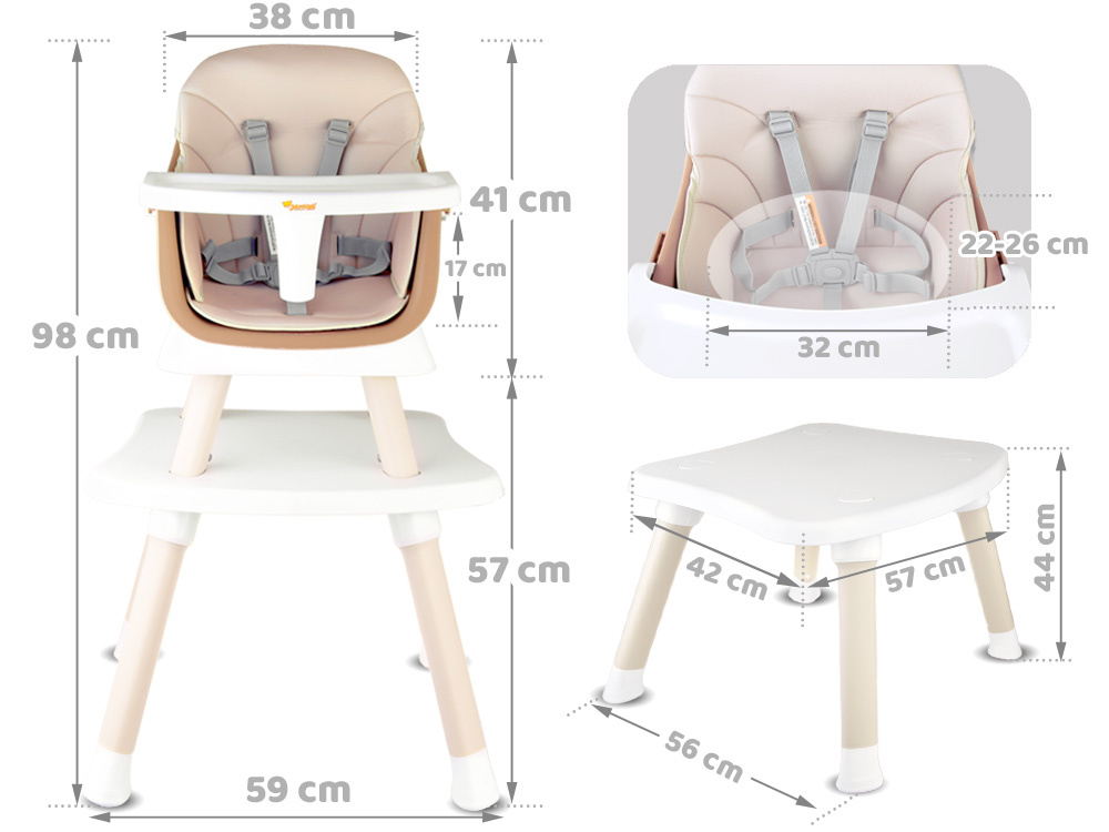 The high chair is a 6-in-1 set, perfect for children from 6 months old who have started to sit on their own. A modular piece of furniture in a modern style, it will fit into any children's room, living room or kitchen. Thanks to its possibility of using it in various options, it will fit the table in the dining room, as well as the children's play corner. A comfortable seat, properly contoured, has five-point seat belts, a blockade against sliding off the chair. The upholstery used to cover the seat is breathable, made of easy-to-clean material, which is important in keeping the furniture clean. The furniture has a removable, easy-to-clean tray. The legs of the chair have non-slip pads. The multifunctional piece of furniture will grow with the child and will easily adapt to the required needs in a given situation.