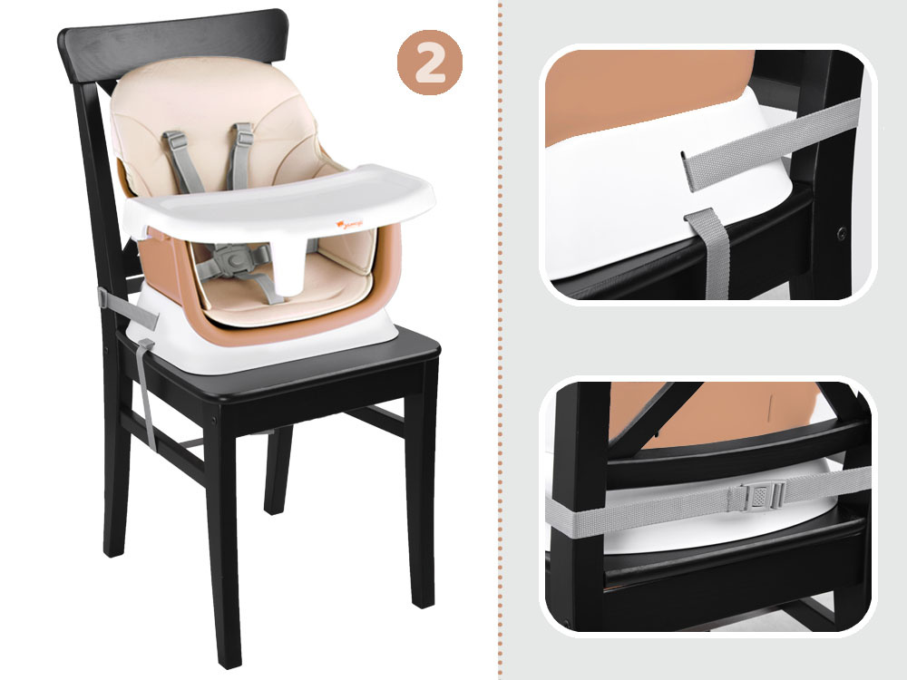 The seat is easy to assemble, thanks to which it will not be difficult to modify the furniture. Everything works with a click, latch, is stable and safe. The chair itself has 5-point safety belts, a blockade between the child's legs, preventing the baby from slipping. The straps for attaching the seat to the chair are strong, so that the baby can sit at the table with his parents and eat a meal together.