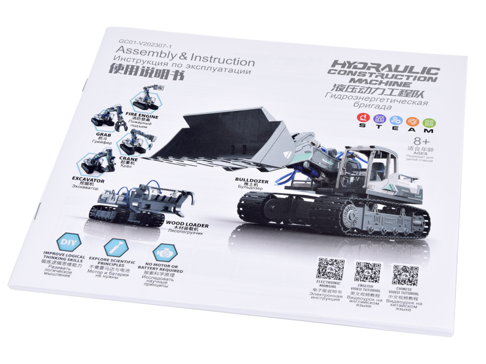 All machines operate on a hydraulic power supply based on plain water. The excavator, log loader and crane offer an impressive range of motion, allowing you to precisely maneuver various elements. Movement of the stick, rotation of the platform, raising and lowering - these are just some of the possibilities that await young designers. Additionally, the set includes detailed assembly instructions, step by step, introducing children to the fascinating world of mechanics.