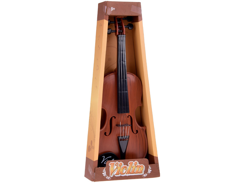 Plastic violin with bow perfectly imitates a real instrument, has small dimensions ideally suited to the small hands of a child. The violin is plastic in a similar wood color, has 4 metal strings and the bow is made of strings. It will serve great as a prop for dressing up.