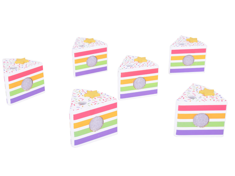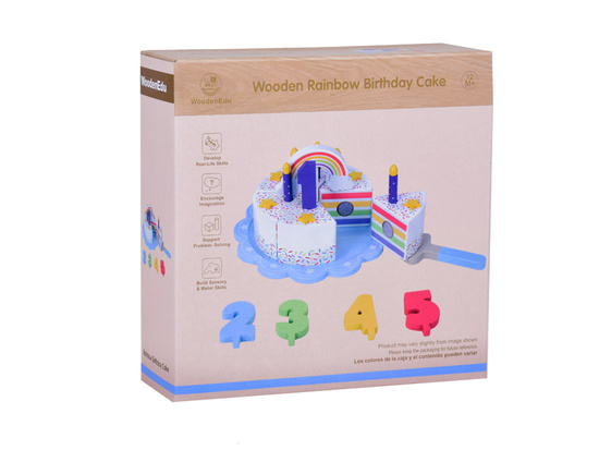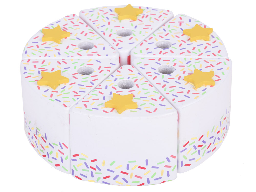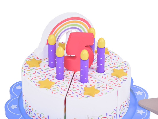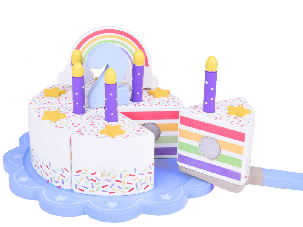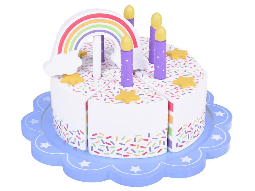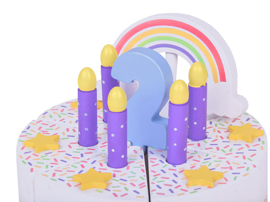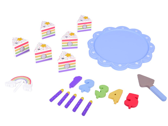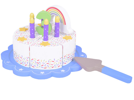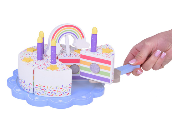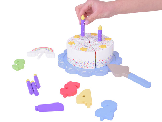 This fantastically made birthday cake is the perfect fun for any party! The colorful cake consisting of six pieces is a great imitation of a real cake, which a child can cut, divide and serve using a spatula. The top of the cake is decorated with a removable colorful rainbow, which adds charm to the whole. Each piece of the cake has a special place for a candle, which makes it an ideal solution for playing with organizing birthday parties.