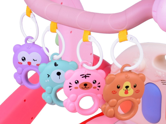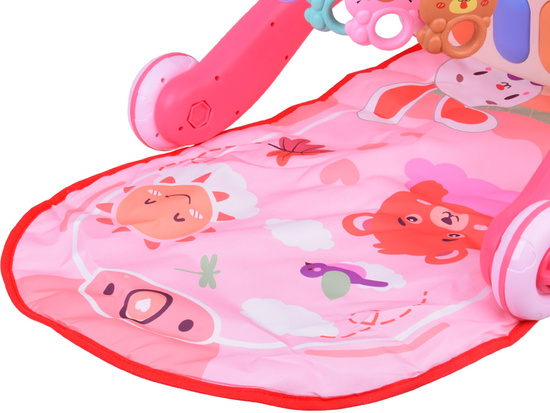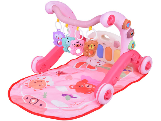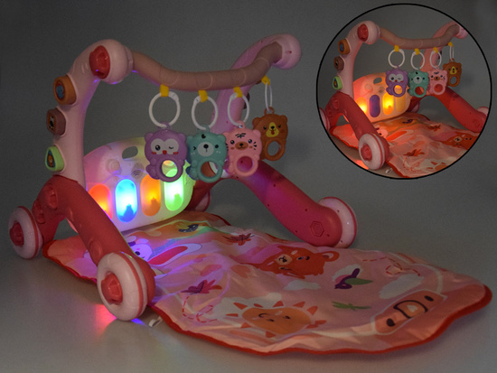 Fun and sensory development: Interactive piano with colorful, illuminated keys and melodies develops hearing and creativity, and colorful animal-shaped pendants encourage grasping, strengthening manual skills. The pusher bar is also equipped with a sorter that stimulates the child to play matching shapes with pastel blocks.