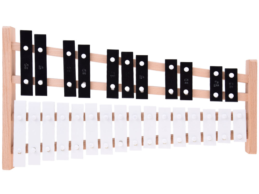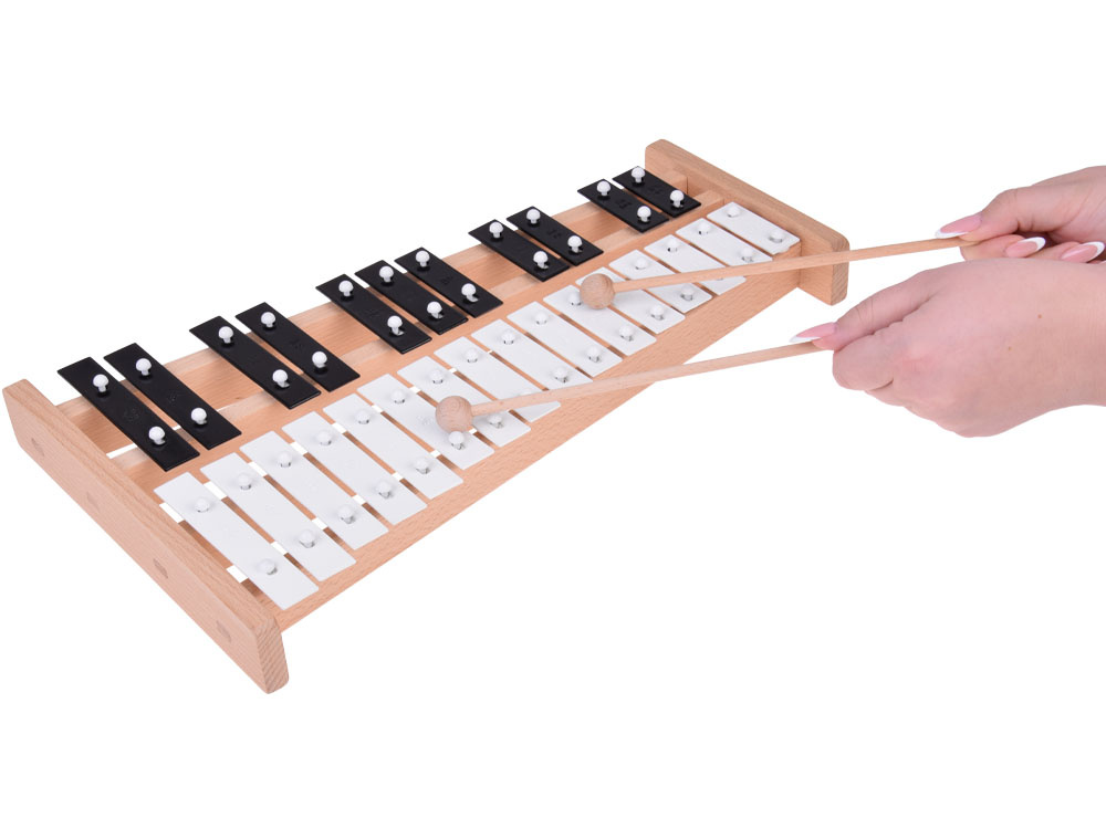 Metal bars guarantee a warm, clear sound also thanks to the use of foam pads under the tiles. Wooden sticks of the perfect size make it easier to extract the perfect sound. The grooved sound markings on the tiles will make playing easier, especially in the initial stages of learning to play the instrument.