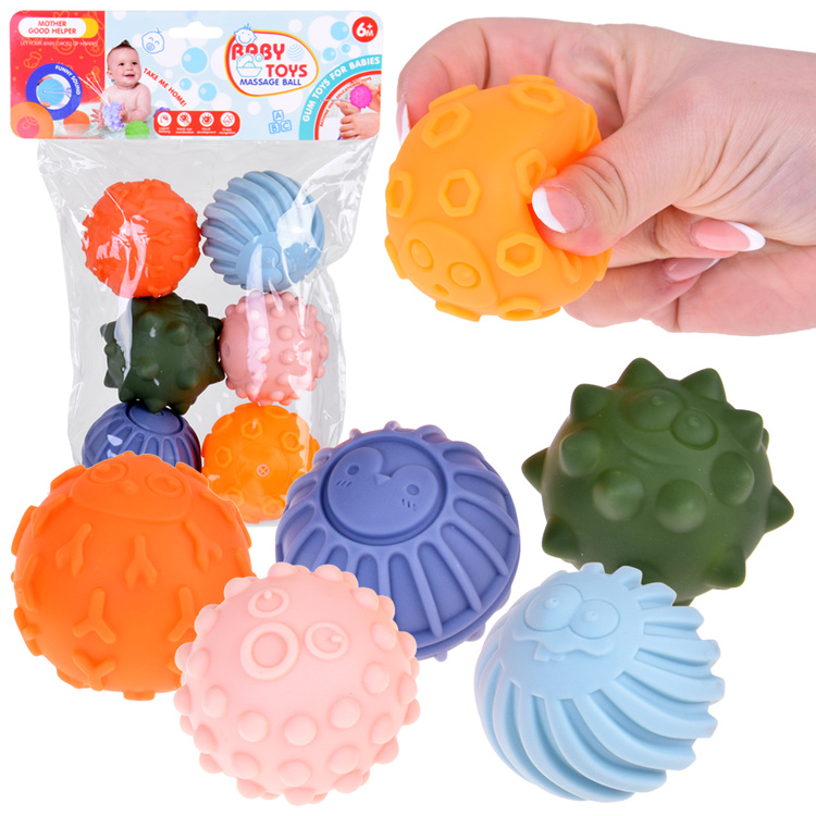 Colourful sensory balls are an excellent choice for play, exercise, massage and sensory therapy. Made of soft, easy-to-clean material, they are safe and pleasant to the touch. Sensory balls make a sound when pressed. Each of the 6 balls has a different shape and structure - various protrusions stimulate the sense of touch and stimulate sensory receptors, supporting the child's sensory development.