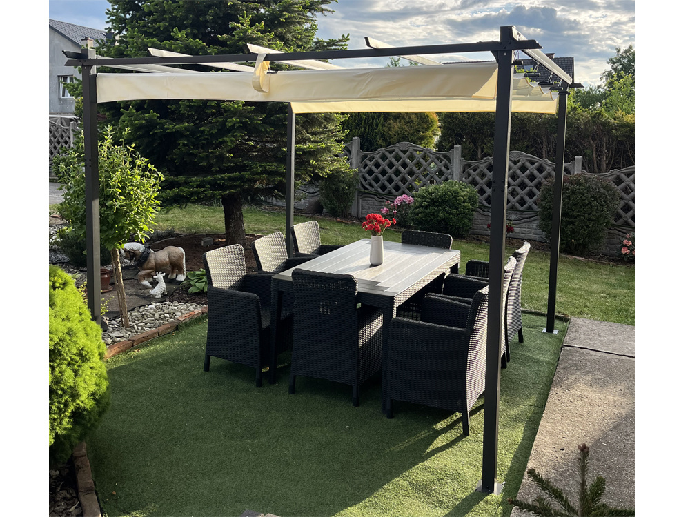 The roof is made of high-quality polyester fabric with a PVC coating in beige, creating a chic contrast with the dark frame. The fabric is water-resistant and UV-protected, so you can enjoy the pergola in both sunny and rainy weather. The canopy can be easily slid open, fully retracted, or even removed for cleaning, seasonal maintenance, or replacement.