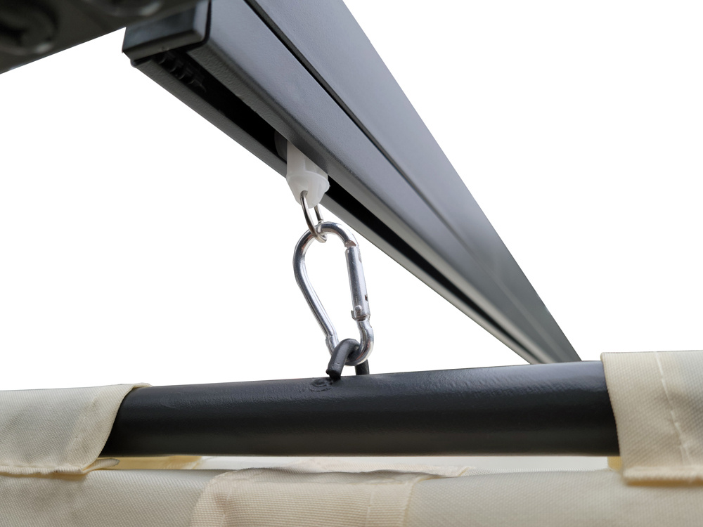 - Roof system: Retractable canopy on a roller, mounted with carabiners