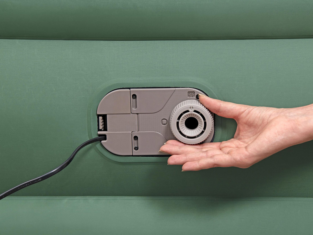 The mattress is equipped with a built-in electric pump (220–240V), allowing it to be fully inflated in approximately 3 minutes. This is a perfect solution when you need to quickly prepare a sleeping area. If needed, the mattress can also be inflated using a manual or foot pump, making it practical even in places without access to electricity.