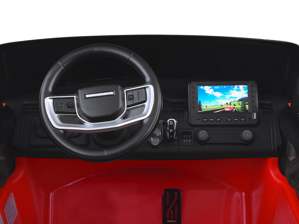 Right next to it, we will find a lever to change the direction of travel forward/reverse and a switch to change the drive from 2x4 to 4x4. Thanks to this, we can adjust the nature of the drive to our current needs. The car has a new solution - the button to change the control from the remote control to manual driving from the steering wheel has been protected with a plastic cover. Thanks to this simple procedure, the child will not be able to take over the controls without our consent.