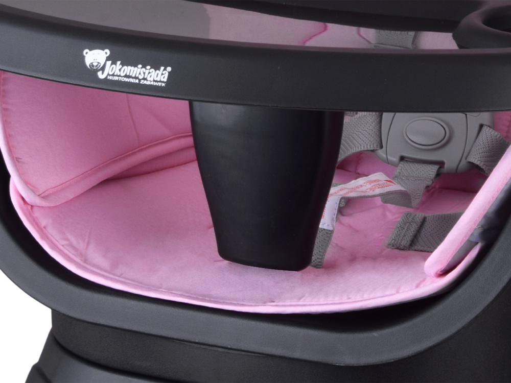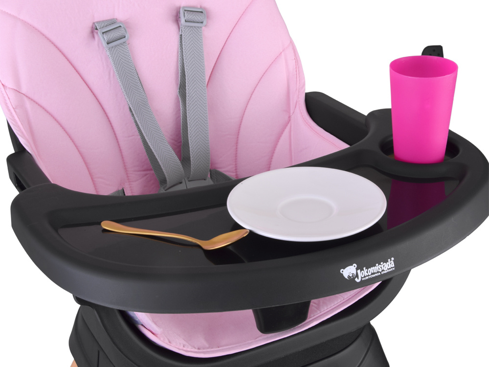 - Highchair – comfortable and stable, with an adjustable tray and safety harness, it ensures comfort for both child and parent. The tray is contoured, removable, and easy to clean – simply rinse under running water or put in the dishwasher. Additionally, there's a practical basket under the chair for small items useful during feeding, such as a cloth diaper, wet wipes, or a favorite toy.