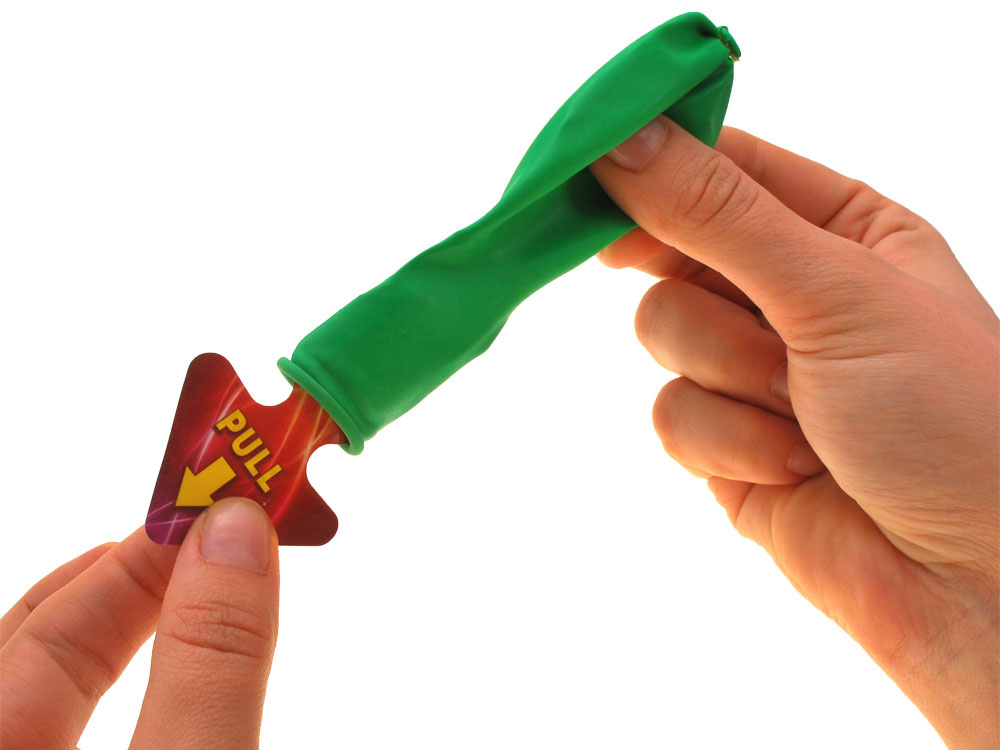 To proste! Wystarczy wyciągnąć zabezpieczenie baterii (pociągnąć za kartonik z napisem PULL, równocześnie trzymając LED umieszczony w balonie) a następnie napompować balon-  helem, za pomocą pompki do balonów, czy siłą własnych płuc:)