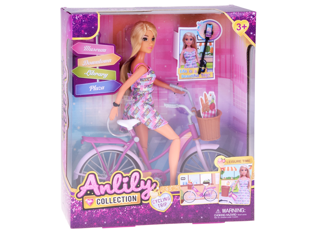 • a sports doll, a bicycle with a basket on rubber wheels, with a footrest, a phone, a selfie stick