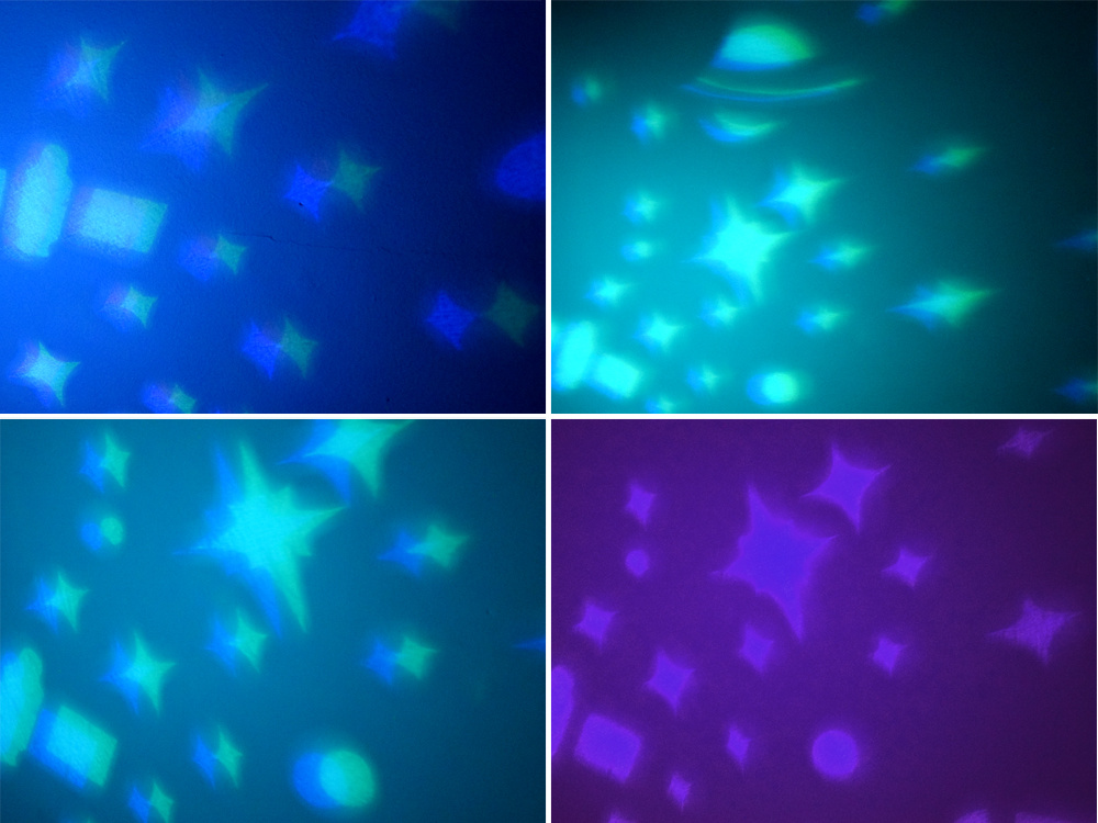 - A projector projects stars, the moon, planets, and rockets through holes in the belly.