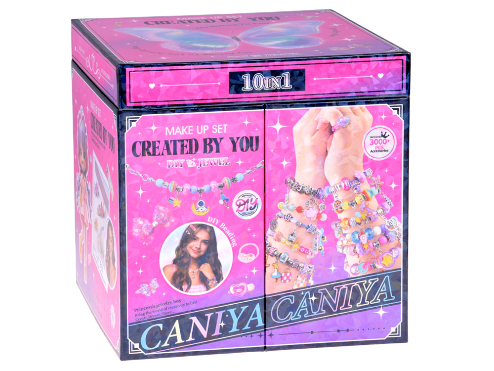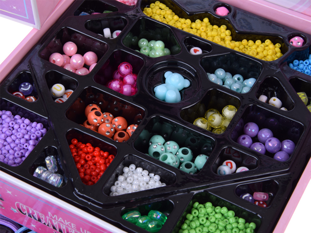 When opened, you'll see a large, practical mirror that will make getting ready easier for any girl. The first level consists of two compartments, containing earrings, rings, and accessories for adorning a metal bracelet and chain. Slide the sides apart, and a colorful feast awaits! The second level holds a wealth of beads in various sizes and colors, allowing you to create your own handmade jewelry. You can use the ideas in the included booklet or create your own ornaments. Under the bead cassette, you'll find a spool of elastic cord for bracelets and a pair of plastic tweezers for easy stringing. Slide out the third level to reveal beautiful hair accessories that will perfectly complement your style. In addition to two hair bands with charming details, you'll find three elegant, elongated hair clips and whimsical bows made of tulle and lace.