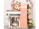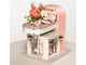 The front of the building resembles an elegant boutique with a “glass” display window showcasing the highlight of the set: a gorgeous wedding gown placed right at the heart of the interior. The dress is adorned with delicate rose accents that perfectly complement the overall color scheme – soft whites, powder pinks, and pastel greens.