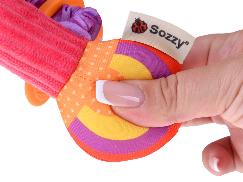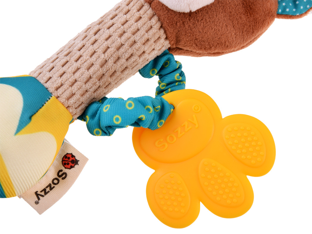 - Do grzechotki dołączono praktyczny i bezpieczny, silikonowy gryzak w kształcie łapki. Jego specjalne wypustki delikatnie masują obolałe dziąsła, przynosząc natychmiastową ulgę w okresie ząbkowania.