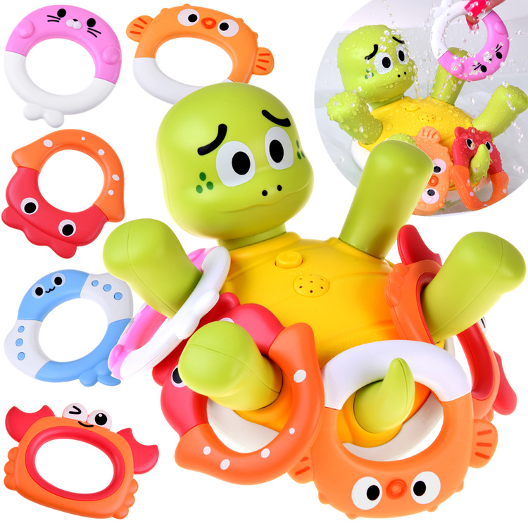Once placed in the water, the turtle starts spraying streams of water, bringing laughter and excitement to children. An extra attraction comes from the interchangeable colorful rings that can be placed on the turtle—each with fun patterns that add variety to playtime.