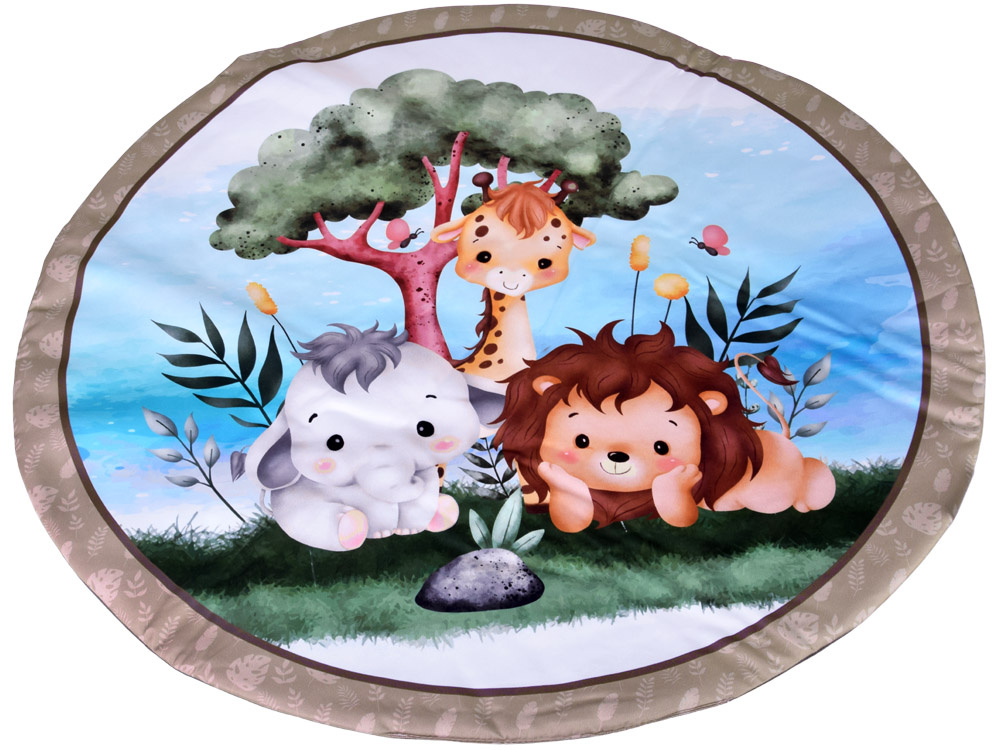 A colorful educational play mat with animals is the perfect place for play and development from the very first days of your baby’s life. The round mat, decorated with cheerful animals (lion, elephant, giraffe), encourages little ones to explore the world while supporting the development of their senses.