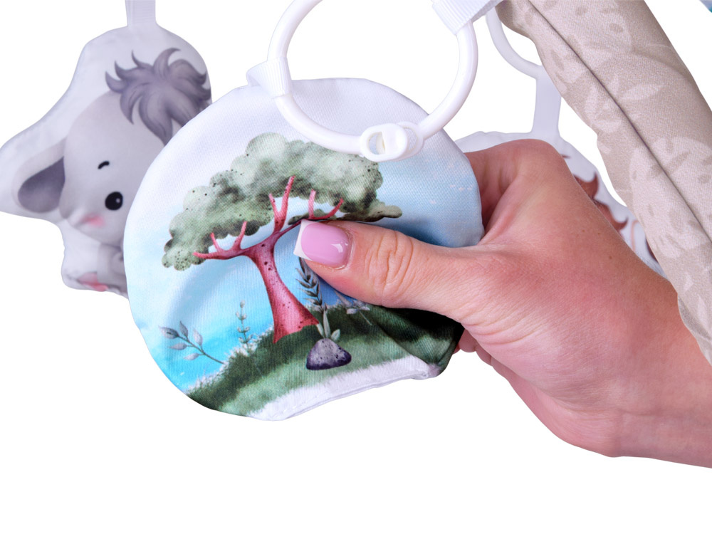 Two soft, flexible arches, covered with multicolored fabric, are equipped with hanging toys – plush animals and a safe mirror. They encourage babies to reach, touch, and kick, helping to develop motor skills and coordination.