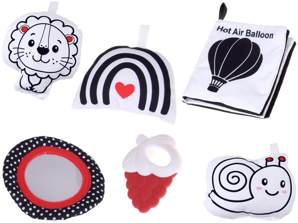 - Contrasting elements (black, white, and red) help develop visual acuity and hand-eye coordination.