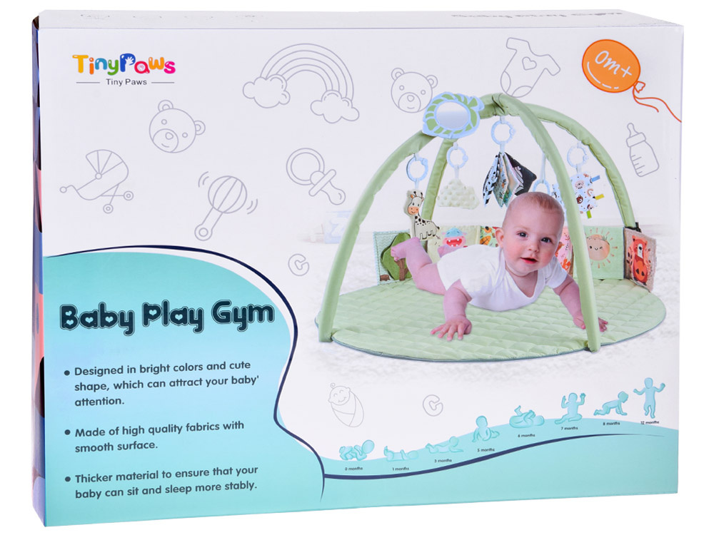 The educational play mat is the perfect space for play and development from the very first days of your baby’s life. The round mat in a soft pastel green color with contrasting elements has been designed to stimulate the development of your child’s vision, hearing, touch, and concentration.