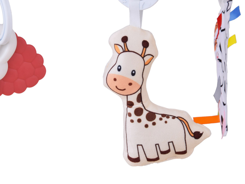hanging toys and accessories: teething toys, plush giraffe, soft cream-colored minky cloud, safe mirror, contrast picture book, crinkle toy with tags