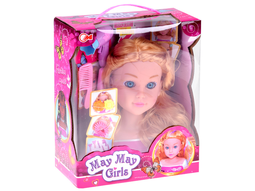 Doll’s head – a charming blonde doll with long hair, big blue eyes, and delicate makeup. The hair can be brushed, tied up, curled, or straightened, allowing for countless hairstyles. The head is mounted on a bust, which makes it stable during play. Dimensions: approx. 20 cm x 18 cm.