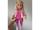 This time, the doll is dressed in a sporty outfit – a comfortable pink tracksuit with a hoodie and pants decorated with a trendy pastel tie-dye pattern. The look is completed with pink and white sneakers, perfectly matching her active style.
