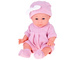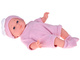 - The doll is dressed in a cute knitted romper and a pink cap with a white bow; she also wears matching pink socks